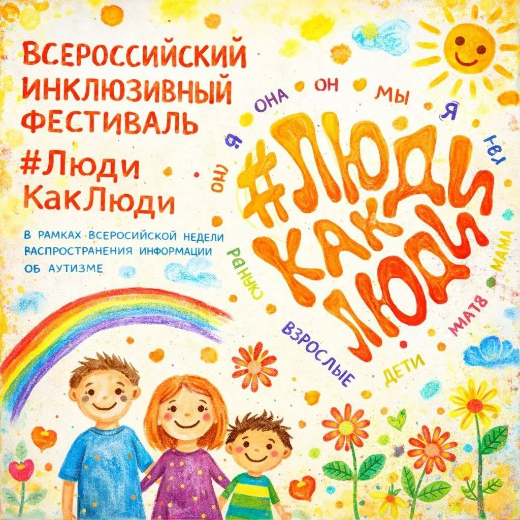 В период с 29 марта по 5 апреля 2026 года проводится юбилейный X Всероссийский инклюзивный фестиваль #ЛюдиКакЛюди, который проводится в рамках Всероссийской недели распространения информации об аутизме в очном, онлайн и смешанном ...