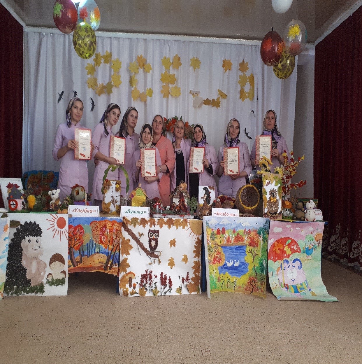 Также прошел конкурс поделок из природного материала. Все родители (законные представители) приняли участие. Чувствовался дух соперничества и переживания. Первое место заняла старшая группа «Бабочки», второе место разделили группы «Лучики» и «Улыбка», третье место разделили группы «Непоседы-Капитошка», «Звездочки» и «Капельки». Группы получили грамоты от руководителя ДОУ.